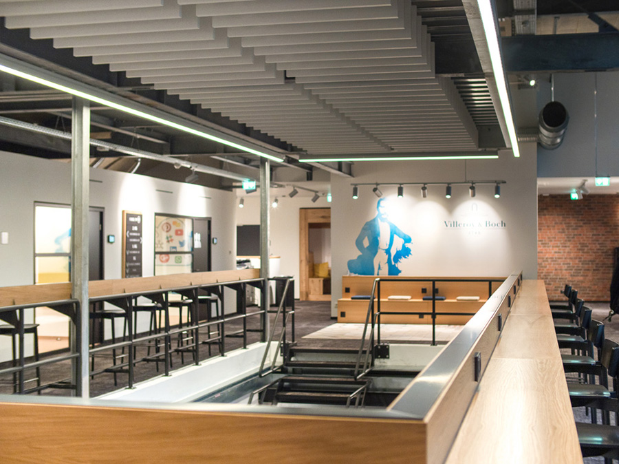 Besonders eindrucksvoll zeigt sich das in der neuen Fabrik No09 von Villeroy & Boch, die 2018 fertiggestellt wurde. Wo sich einst Lager- und Produktionsräume befanden, erinnert heute nur noch der Name an die Vergangenheit. Das neue Büro- und Konferenzzentrum löst mit einem breiten Arbeitsplatzangebot klassische Strukturen auf: Offene Flächen und vielfältige Arbeitsbereiche fördern die Kommunikation und Zusammenarbeit unter den mehr als 200 Mitarbeitern im Bereich Marketing, Online, PR sowie Produktentwicklung und -management. Rund 4.500 Quadratmeter auf 3 Etagen umfasst das Gebäude, dessen Mittelpunkt eine große Treppe aus Eichenholz im neuen Eingangsbereich ist. Wer diese emporsteigt, dem ist wahrscheinlich eines gar nicht bewusst: Hier, auf dem Weg vom Erdgeschoss ins erste Geschoss, verbirgt sich eine clevere Sonderlösung, die mit Blick auf den Brandschutz unsichtbar für Sicherheit sorgt.