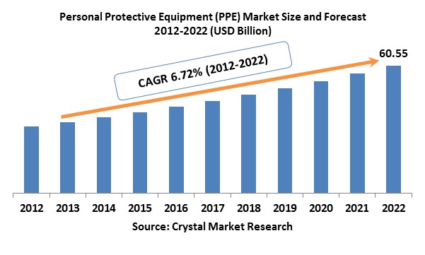 The Personal Protective Equipment (PPE) Market was worth USD 31.60 billion in the year of 2012 and is expected to reach approximately USD 60.55 billion by 2022, while registering itself at a compound annual growth rate (CAGR) of 6.72% during the forecast period.