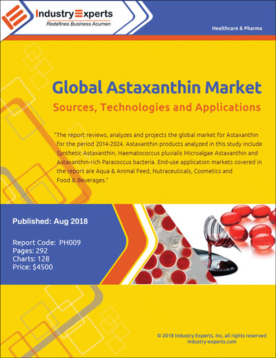 Industry Experts, Inc. published an updated 2018 version of the exclusive comprehensive global market report on Astaxanthin. The new report entitled "Global Astaxanthin Market – Sources, Technologies and Applications" reveals that the global market for Astaxanthin is forecast to cross 360 metric tons in 2018.