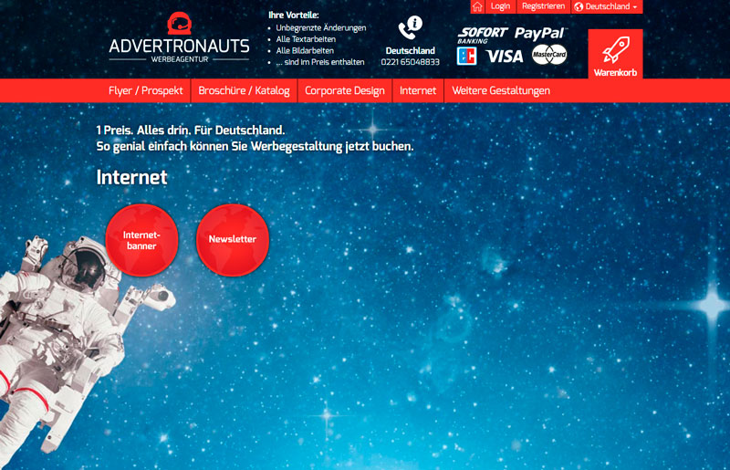 Im Preis bei Advertronauts Deutschland ist alles schon drin. Alle Textarbeiten, alle Bildarbeiten, unbegrenzte Änderungen bis zu Ihrer Freigabe/Abnahme - egal wie viele es werden - sowie der Uplaod für jeden Server Ihrer Wahl. Kommen Sie und entdecken Ihre Wunsch-Gestaltung für das Internet bei der Werbeagentur Advertronauts Deutschland.