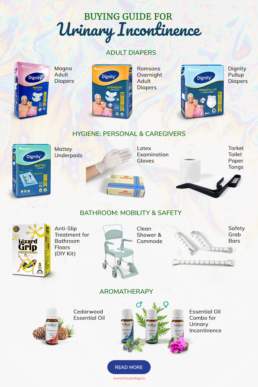 Here's a set of things to use which will help you manage Urinary Incontinence and bladder control issues. It's not just about using Adult Diapers & Commode shower chairs, there are must-haves like Anti-slip treatment for floors and grab bars for bathroom safety as one may be in a rush! Essential Oil Combo of Cypress, Juniper Berry, and Geranium oils is very effective when used by inhalation through diffuser or application by mixing with any base oil like coconut, walnut, apricot or almond. Read more here.