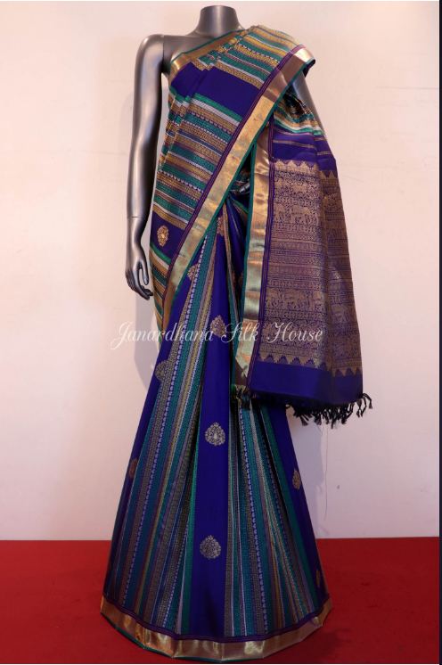 Janardhana Special. Hand Woven Pure Kanjeevaram Silk Saree In Classic & Exclusive Meenakari Weave With Special Zari Buttas & A Traditional Zari Border.Adoring With a Rich Zari Pallu and Also Has an Attached 0.8 m Kanjeevaram Silk Blouse.