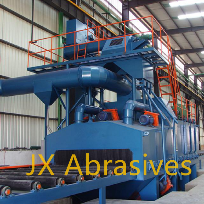 The machine consists of roller conveyor system, blasting system, abrasive circulation system (separator, bucket elevator, screw conveyor), dust collection system and electric control system. The surface finish level is Sa2.5.