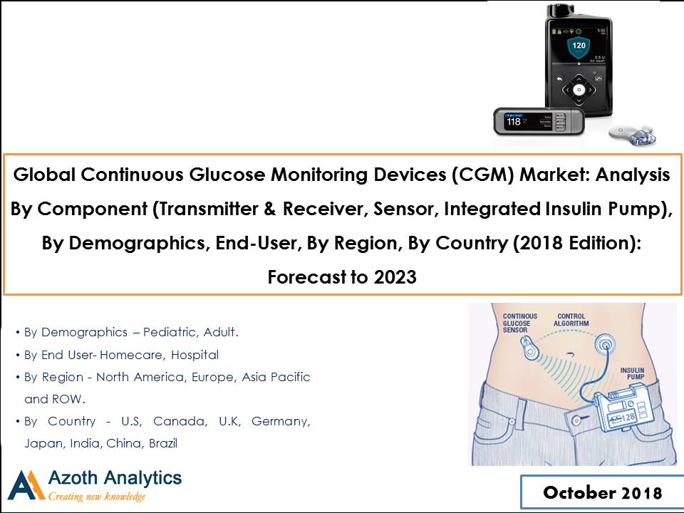 According to Azoth Analytics research report “Global Continuous Glucose Monitoring Devices (CGM) Market: Analysis By Component (Transmitter & Receiver, Sensor, Integrated Insulin Pump), By Demographics, End-User, By Region, By Country (2018 Edition): Forecast to 2023”, the global market is projected to display a high growth represented by a CAGR of 21.25% during 2018 – 2023.