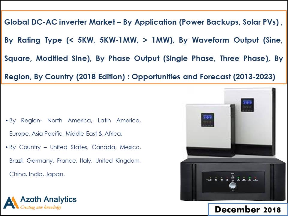 According to Azoth Analytics research report “Global DC-AC Inverter Market – By Application (Power Backups, Solar PVs) , By Rating Type (< 5KW, 5KW-1MW, > 1MW), By Waveform Output (Sine, Square, Modified Sine), By Phase Output (Single Phase, Three Phase), By Region, By Country (2018 Edition): Opportunities and Forecast (2013-2023)” Global DCE-AC inverter market is projected to display growth represented by a CAGR of over 5.52% during 2018 – 2023, primarily driven by growing industrialization and trend of using renewable energy for the generation of electricity. Leading DC-AC inverters manufacturing companies are developing power optimizing solutions for energy saving purposes which might help the inverter market to expand in forecasted period. There is a tremendous increase in the Global PV installed capacity net addition and thus the demand for the solar inverters is expected to increase from various sectors.Visit us: http://azothanalytics.com/research/energy-utilities-c2
