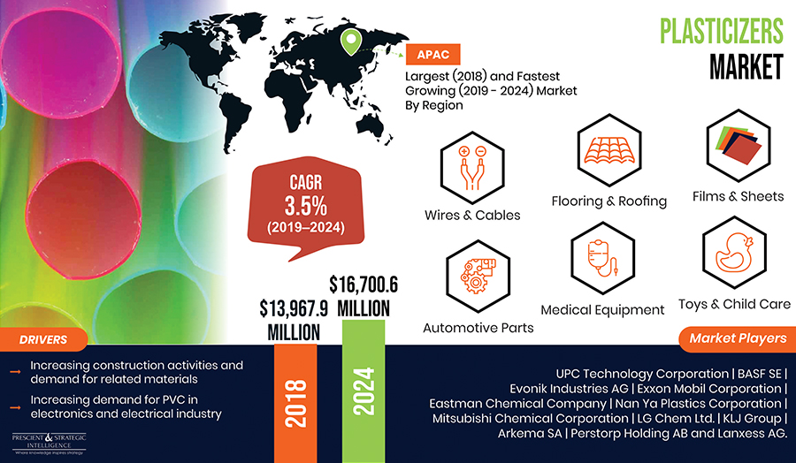 In 2018, the plasticizers market valued $13,967.9 million, and it is predicted to reach $16,700.6 million by 2024, witnessing a 3.5% CAGR during 2019–2024 (forecast period). The increasing demand for polyvinylchloride (PVC) in the electronics and electrical industry and requirement for construction material is driving the market growth. Plasticizers are additives used during the manufacturing of plastics, to improve their performance, as they are usually cheaper than other additives.