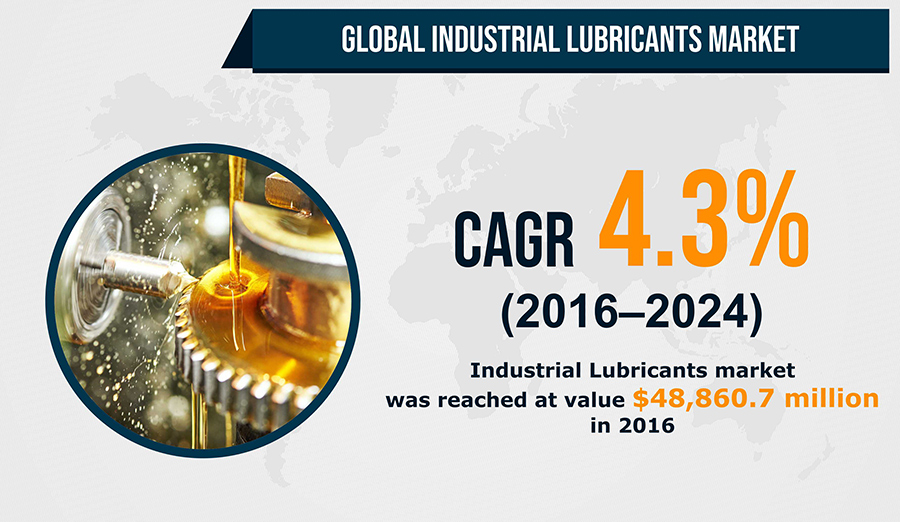 The increasing usage of industrial lubricants in textile, chemical manufacturing, and metal working industries is driving the global industrial lubricants market growth. The market generated a revenue of $48,860.7 million in 2016, and is expected to advance at a CAGR of 4.3% during the forecast period (2016–2024). Industrial lubricants such as oil, grease, and fluids are used in machinery components to protect them from wear and tear and lessen friction and binding. In some cases, they are used to reduce the electricity resistivity and escalate thermal conductivity at the same time.