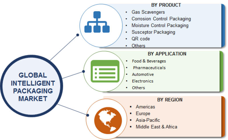 Global intelligent packaging market is segmented into product, application and region. By the product, it is categorized into gas scavengers, corrosion control packaging, moisture control packaging, susceptor packaging, QR code, and others. The scavengers segment is estimated to hold the largest share of the global market due to safety & quality indicators in the intelligent packaging. The application segment includes various industries such as food & beverages, pharmaceuticals, automotive, electronics, and others. Rising demand for packaged and frozen food is driving the food & beverage segment and is likely to continue growing in the future. By geography, it is segmented by North America, Europe, Asia Pacific, and the Middle East & Africa. North America is expected to Account for a significant share of the market due to increased purchasing power and changing lifestyle of people.