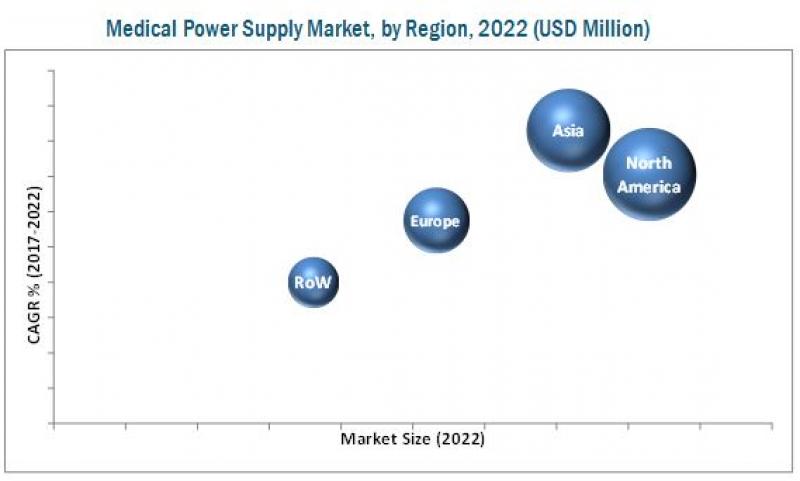 According to the new market research report "Medical Power Supply Market by Current Type (AC-DC Power Supply), Application (Monitoring Equipment (MRI, ECG, EEG, PET, Multiparameter Monitor, Ultrasound, X-ray, MEG), Construction (Enclosed, External), Power Ranges (200w) - Global Forecast to 2022", published by MarketsandMarkets™, analyzes and studies the major market drivers, restraints/challenges, and opportunities in North America, Europe, Asia-Pacific, and the Rest of the world (RoW).