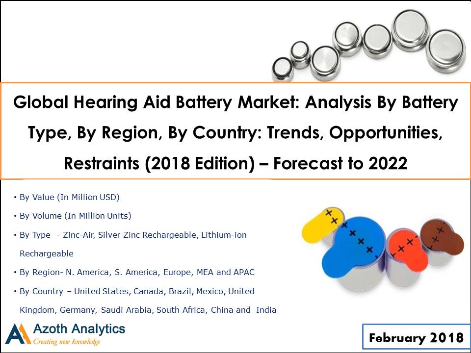 According to Azoth Analytics research report “Global Hearing Aid Battery Market: Analysis By Battery Type, By Region, By Country - Trends, Opportunities, Restraints (2018 Edition) – Forecast to 2022: By Region (N. America, S. America, Europe, APAC, MEA), By Country (US, Canada, Brazil, Mexico, Germany, UK, Saudi Arabia, South Africa, China, India)” global market value is projected to display a robust growth represented by a CAGR of 1.97% during 2017 – 2022.