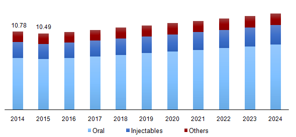Segmentation by Route of Administration, 2014 - 2024 (USD Million)