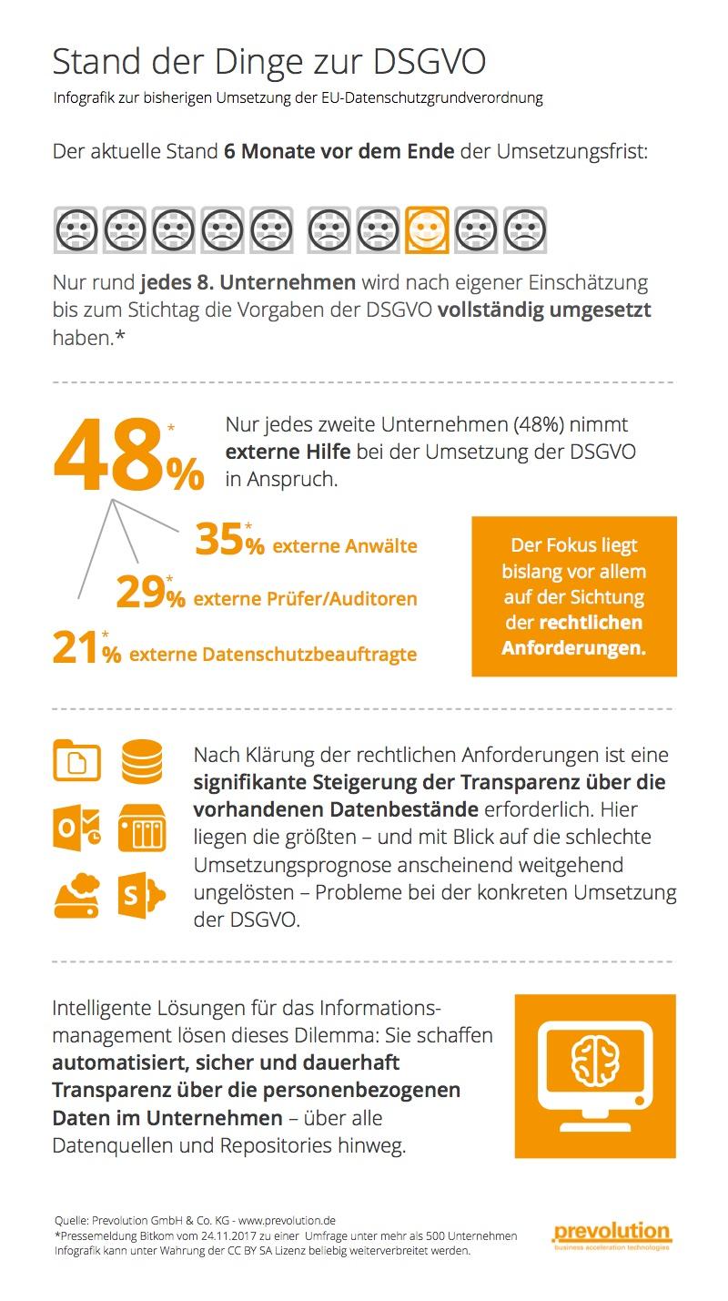 Hamburg, 28.11.2017 - Prevolution, Spezialist für integriertes Service- und Information-Management, erläutert den aktuellen Stand der Umsetzung der EU-Datenschutzgrundverordnung (DSGVO). Die DSGVO ist nach einer Übergangszeit von zwei Jahren ab dem 25.5.2018 - in weniger als sechs Monaten - verpflichtend anzuwenden. In einer aktuellen Umfrage unter mehr als 500 Unternehmen hat der Digitalverband Bitkom Daten zum Stand der Umsetzung der DSGVO erhoben. Dabei wurde deutlich, wie weit die Unternehmen noch von einer vollständigen Umsetzung entfernt sind: Nur jedes achte Unternehmen geht derzeit davon aus, die DSGVO zum Stichtag vollumfänglich zu erfüllen.