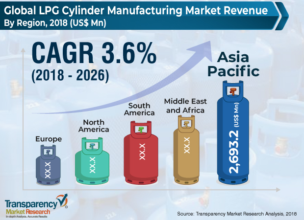 According to a new market report published by Transparency Market Research titled “LPG Cylinder Manufacturing Market, Material – Steel, Aluminum; Size – 4 Kg-15 Kg, 16 Kg-25 Kg, 25 Kg-50 Kg, More than 50 Kg; End-use – Domestic, Commercial, Industrial – Global Industry Analysis, Size, Share, Growth, Trends, and Forecast, 2018 – 2026,” the global LPG cylinder manufacturing market is expected to reach US$ 4.7 Bn by 2026, expanding at a CAGR of 3.6% from 2018 to 2026. Asia Pacific held the highest share in the LPG cylinder manufacturing market in 2017.