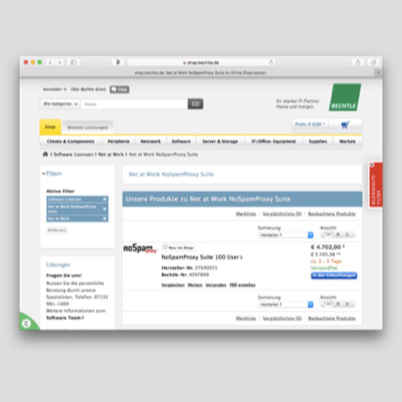 Paderborn, 14. Juni 2017 - Als Softwarehaus entwickelt und vermarktet Net at Work mit NoSpamProxy eine integrierte Gateway-Lösung für Secure E-Mail. NoSpamProxy ist einfach in der Anwendung, Cloud-fähig und punktet mit einem großen Leistungsumfang sowie dem Gütesiegel Made in Germany. Funktionen wie die sichere Anti-Malware-/Anti-Spam-Funktionen, eine automatisierte E-Mail-Verschlüsselung und der praxistaugliche Dateitransfer überzeugen auch Bechtle. Zahlreiche Standorte des IT-Unternehmens realisierten mit der Software bereits rund 100 Projekte. Durch die Aufnahme in das Bechtle Software-360-Programm steht NoSpamProxy Bechtle Kunden über alle Verkaufskanäle - unter anderem auch über den Bechtle Shop - zur Verfügung.